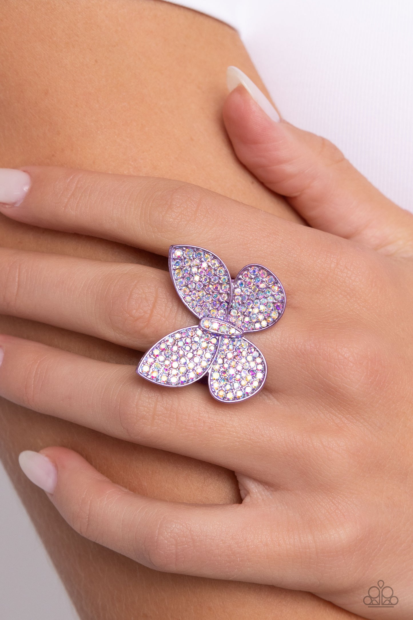 Featuring a surface of iridescent rhinestones, an electric purple butterfly flutters atop the finger for a magically whimsical statement. Features a stretchy band for a flexible fit. Due to its prismatic palette, color may vary.