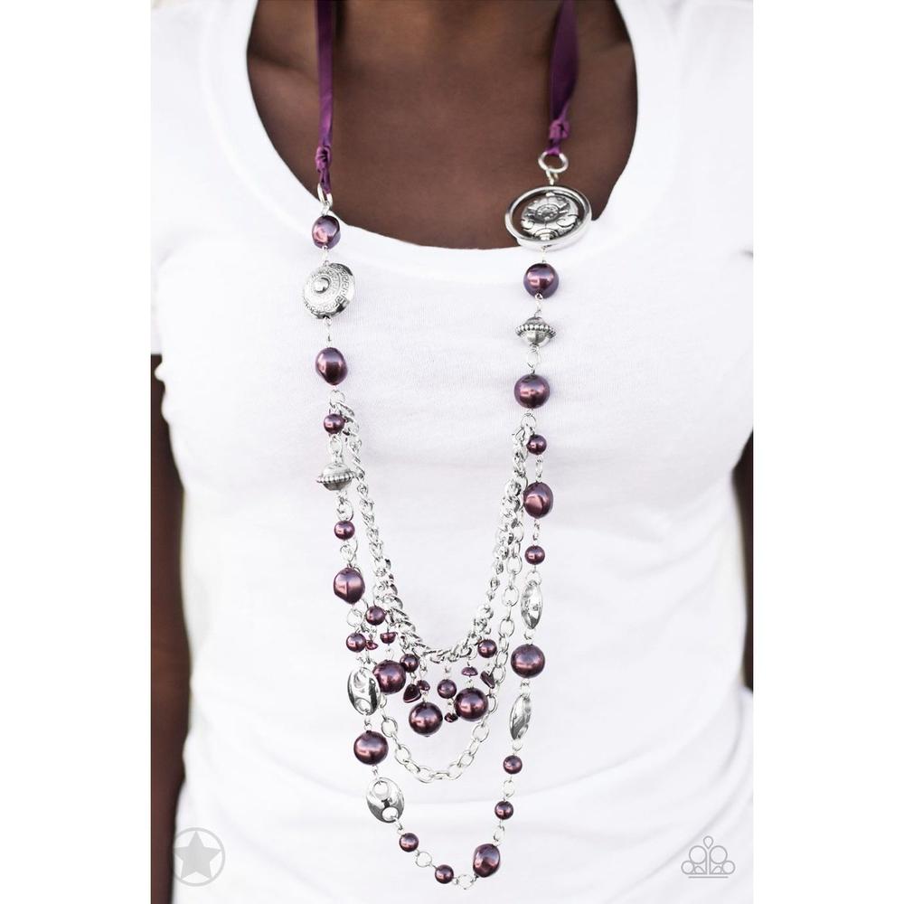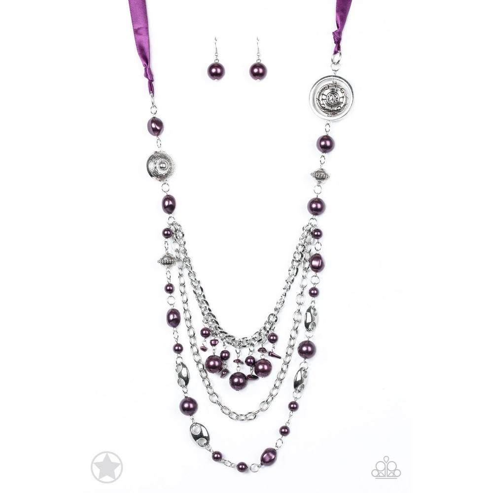 A silky purple ribbon replaces a traditional chain to create a timeless look. Pearly deep purple beads and funky silver pieces intermix with varying lengths of silver chains to give a fresh take on a Victorian-inspired piece.