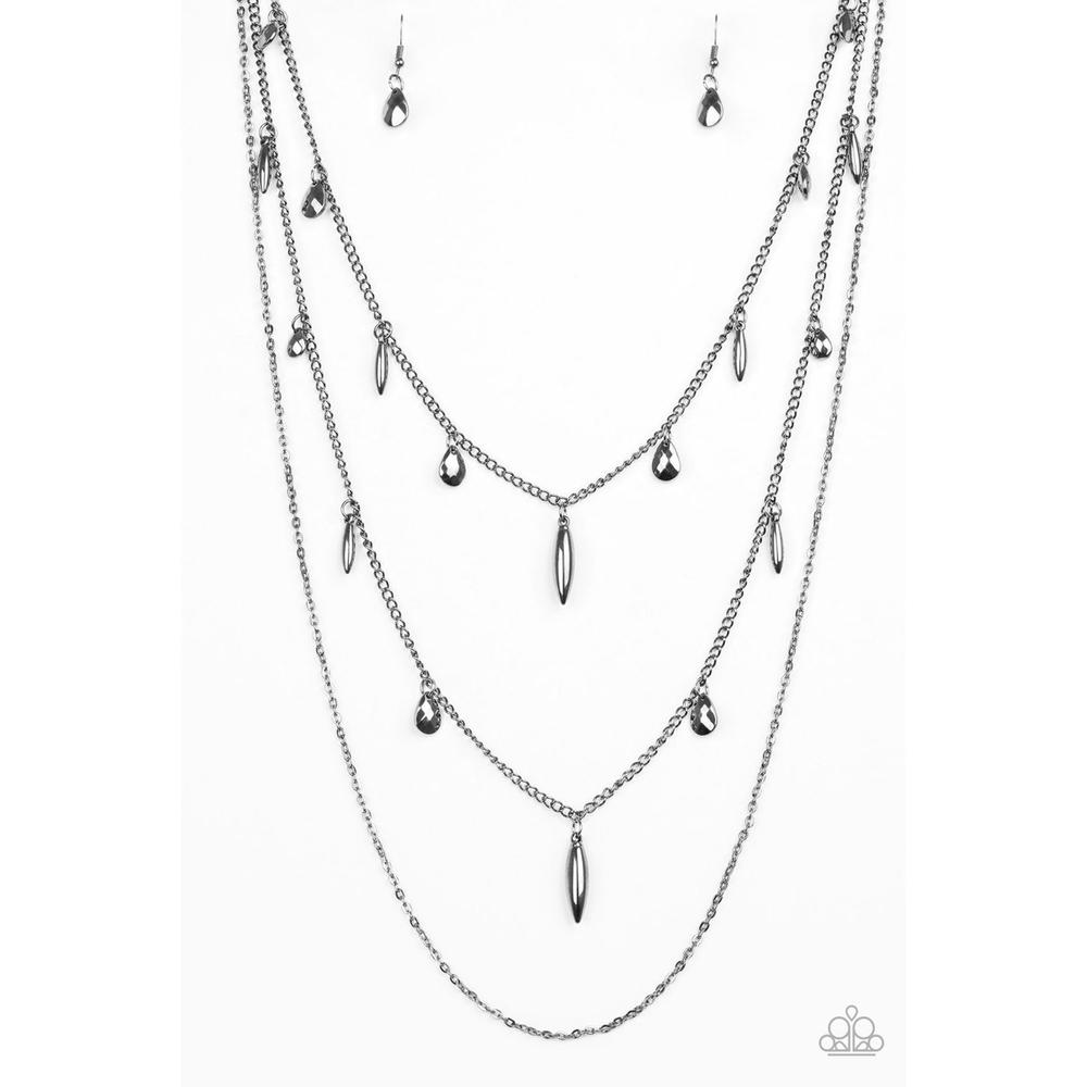 Mismatched gunmetal chains layer down the chest. Faceted gunmetal teardrops and shiny gunmetal accents swing from two of the shimmery gunmetal chains for an edgy finish. Features an adjustable clasp closure.