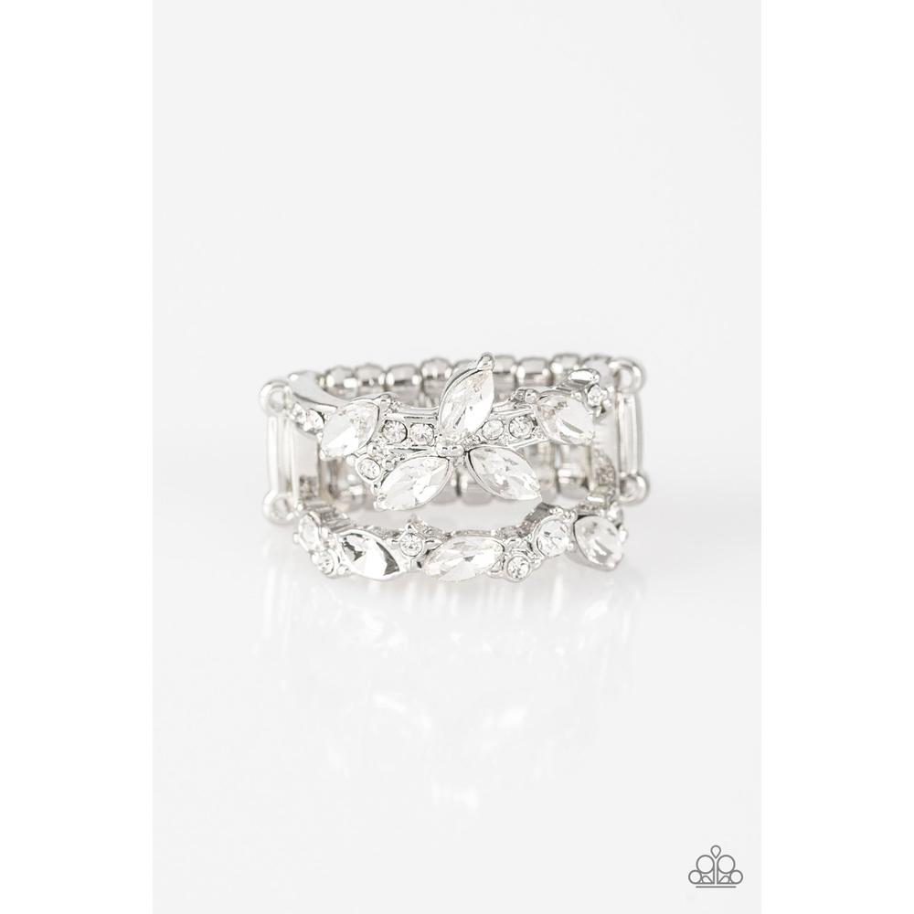 Featuring round and regal marquise style cuts, glittery white rhinestones stack across the finger in two glittery bands. Features a stretchy band for a flexible fit.