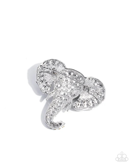 Dusted in dainty white rhinestones in varying sizes, a glistening oversized silver elephant head, complete with black marquise-cut gem eyes and silver tusks, serenely curls its trunk for a timeless centerpiece. Brooch measures approximately 2" in length and 2" in width.