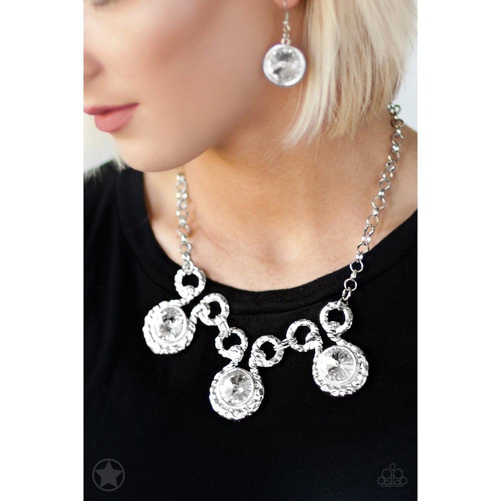 Three dramatically oversized rhinestones are nestled into three textured silver fittings that are connected by oval silver rings, creating a brilliant statement piece. Features an adjustable clasp closure.
