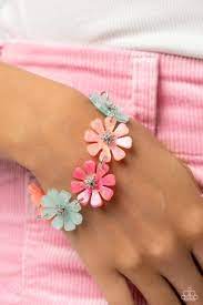 Featuring a soft, speckled pattern, a collection of blue, pink, and coral pastel acrylic flowers bloom around tactile silver studded centers for a whimsical display around the wrist. Features an adjustable clasp closure.